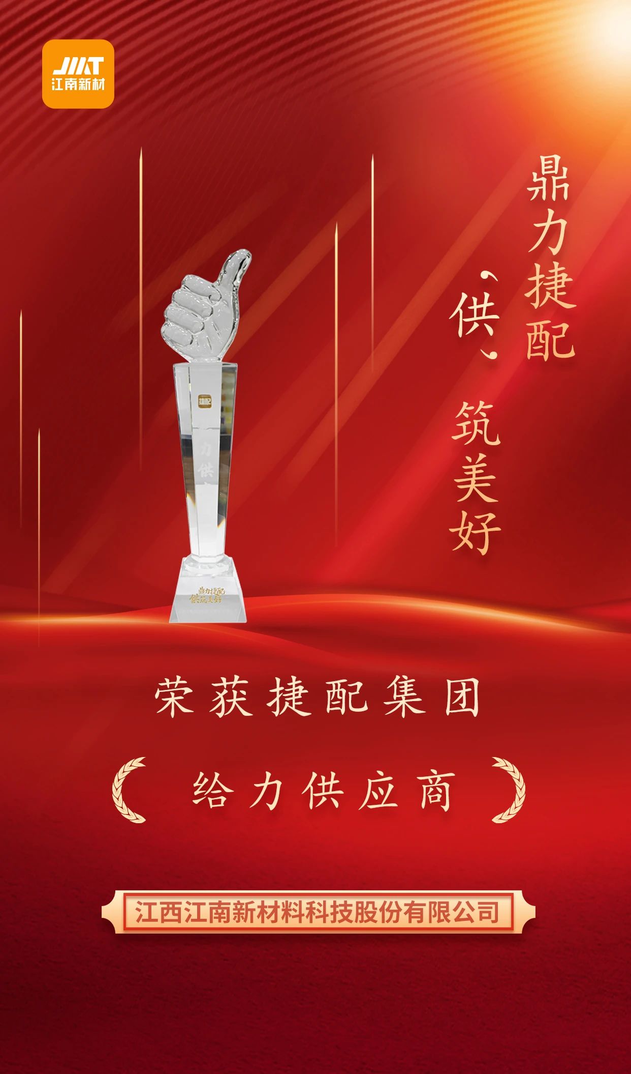 會(huì)上,為表彰并鼓勵(lì)優(yōu)秀的供應(yīng)鏈合作伙伴,本次活動(dòng)面向供應(yīng)鏈伙伴設(shè)立多個(gè)獎(jiǎng)項(xiàng),包括“筑力獎(jiǎng)、給力獎(jiǎng)、鼎力獎(jiǎng)”等。江南新材憑借卓越的品質(zhì)與合作表現(xiàn)榮獲了捷配集團(tuán)授予的“給力供應(yīng)商獎(jiǎng)”。