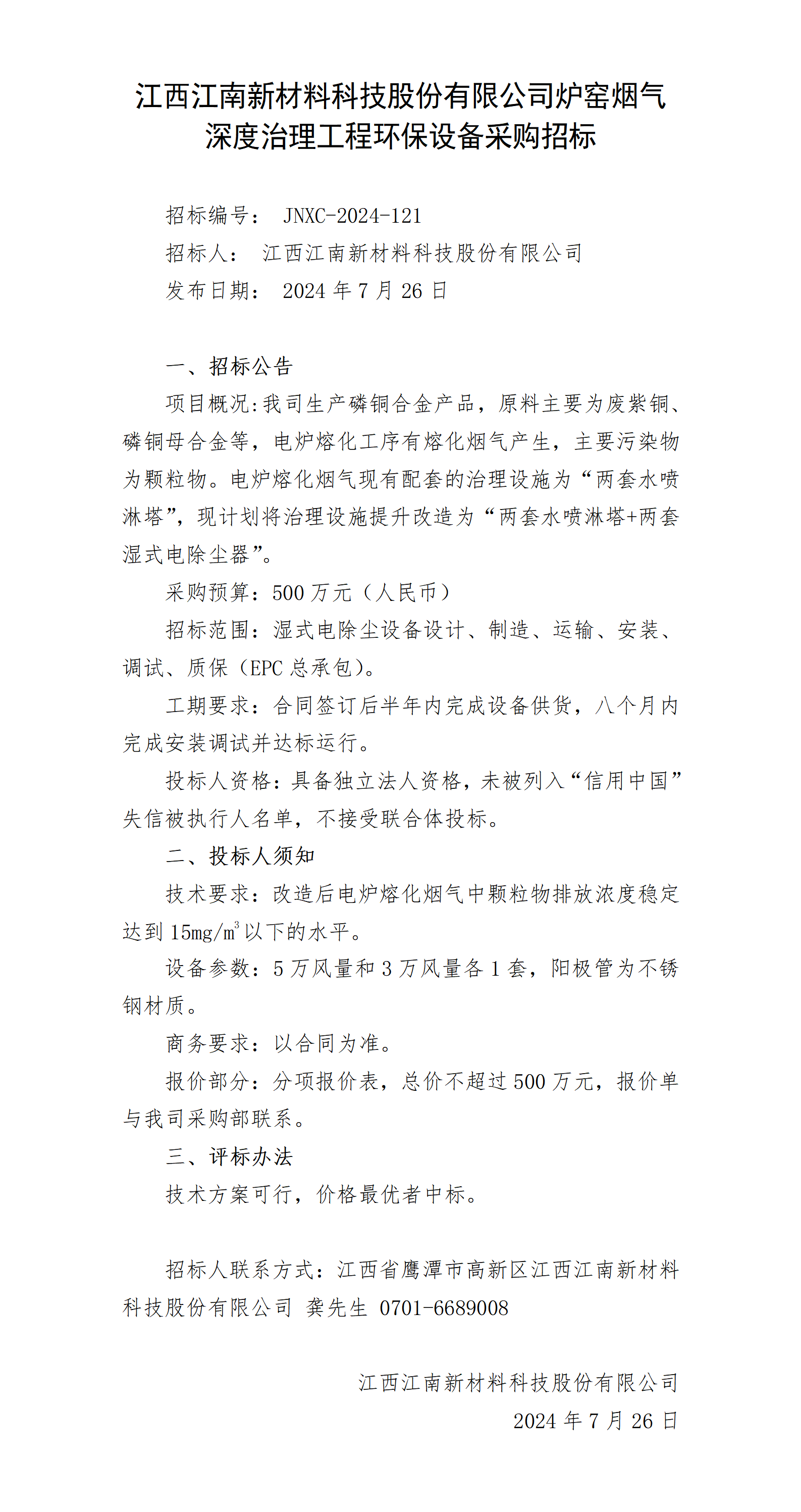 江西江南新材料科技股份有限公司爐窯煙氣深度治理工程環(huán)保設(shè)備采購(gòu)招標(biāo)