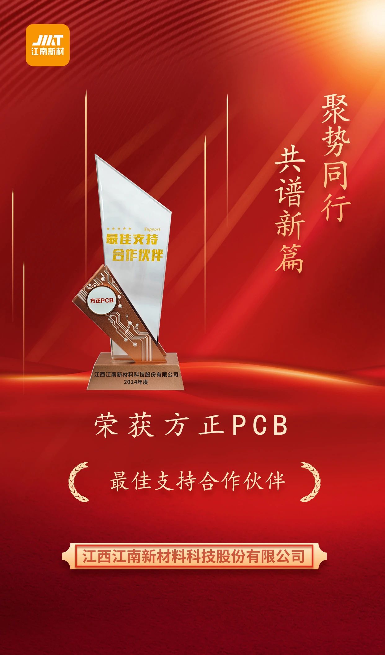 會(huì)上,表彰并鼓勵(lì)優(yōu)秀的供應(yīng)鏈合作伙伴,江南新材憑借卓越的品質(zhì)與合作表現(xiàn)榮獲了方正PCB授予的“最佳支持合作伙伴”獎(jiǎng)。