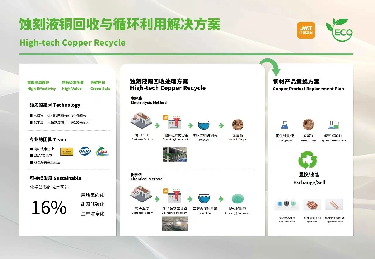 江南新材始終在綠色制造上投入研發(fā),可根據(jù)下游PCB客戶工廠的實際情況,為客戶量身定制含銅蝕刻液回收再利用項目,實現(xiàn)對銅資源進行更高效的轉(zhuǎn)化循環(huán)。該項目作為江南新材在供應(yīng)鏈上的增值價值服務(wù),不僅可以促進行業(yè)的綠色轉(zhuǎn)型與環(huán)境的持續(xù)改善,更可幫助客戶實現(xiàn)資源循環(huán),創(chuàng)造更大資源價值。