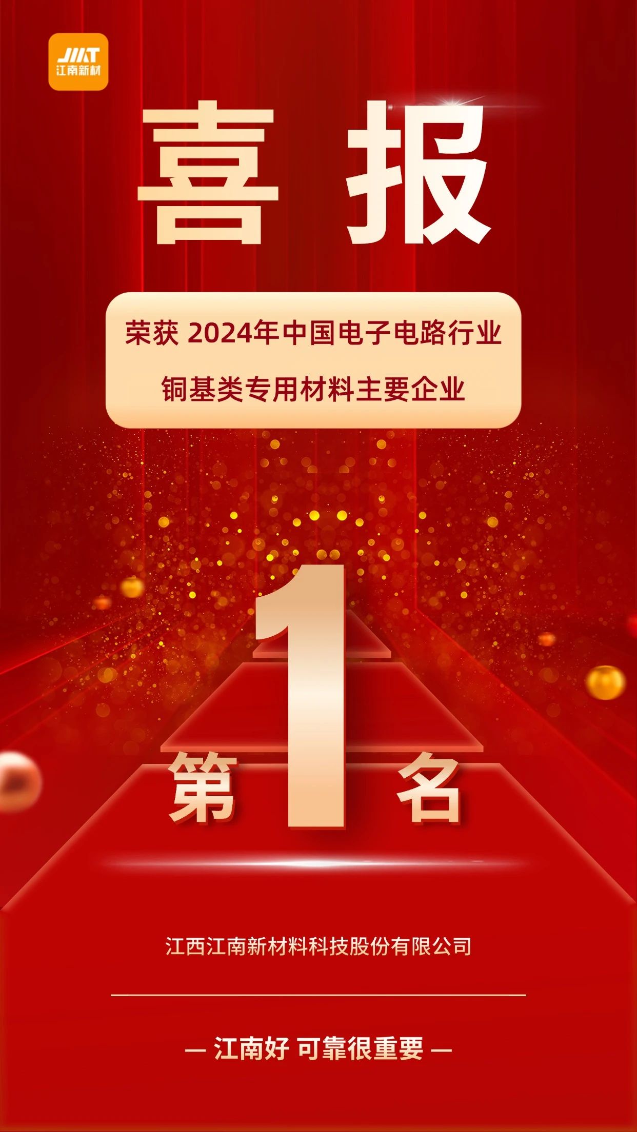 5月15日,中國電子信息行業(yè)聯(lián)合會與中國電子電路行業(yè)協(xié)會(CPCA)聯(lián)合發(fā)布《第二十四屆中國電子電路行業(yè)主要企業(yè)營收榜單》。江南新材再次榮獲中國電子電路行業(yè)主要企業(yè)——“銅基類專用材料主要企業(yè)第一名”。